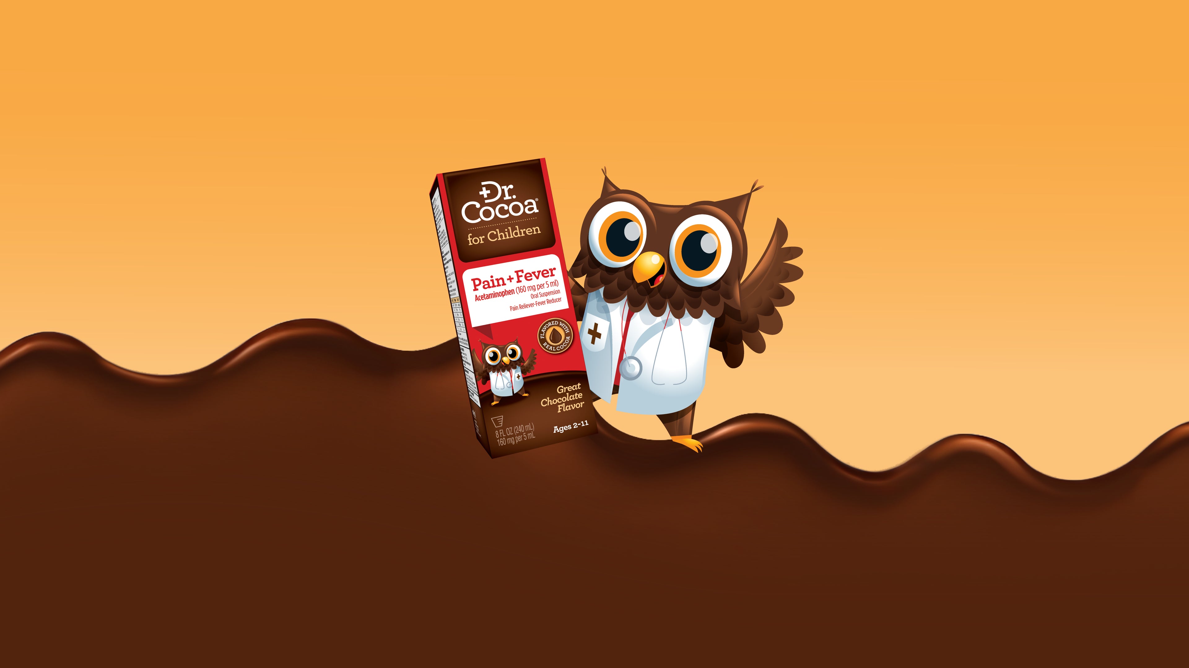 Dr. Cocoa® children's pain and fever medicine is different. Its patented formula is made with trusted, effective ingredients and real cocoa for a rich, soothing, chocolate taste. So kids won’t turn away or fight you when you give them Dr. Cocoa. They’ll be happy to take it, and you will be happy with the pain and fever relief it provides them.